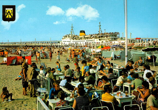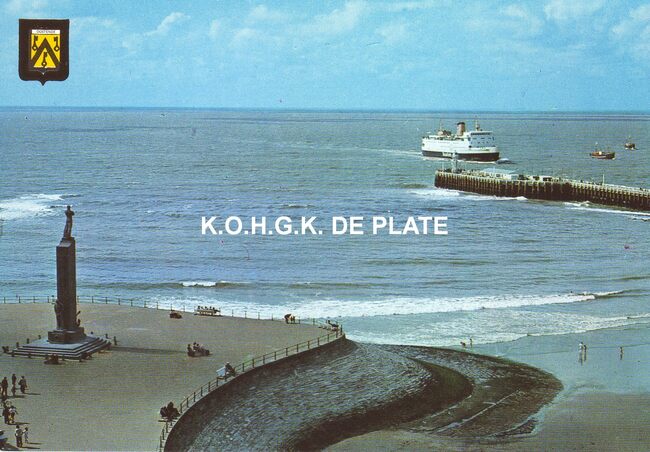 J.V.D.B. - Het Zeeheldenplein met het "Nationaal Monument voor de Zeeliden". Rechts, het Klein Strand. Een carferry van de RMT-Sealink nadert de havengeul. We zien ook gedeelte van het Weststaketsel