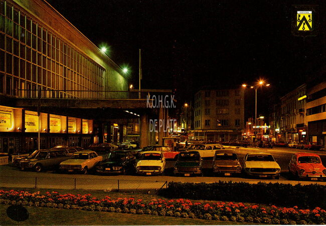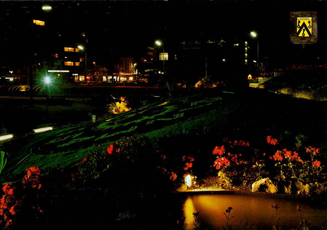 JVDB, N° ZN/8. - Nachtopname. De muziekkiosk verlicht op het Wapenplein. Een muziekharmonie speelt een concert. In de zeventiger jaren speelde op donderdag- en zondagavond de stadsharmonie. Koning auto kon toen nog zonder…