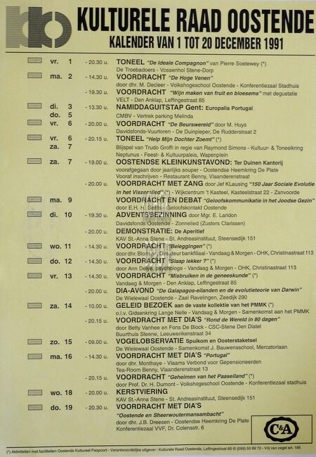 Affiche : Kulturele Raad Oostende. Kalender. 1 tot 20 december 1991