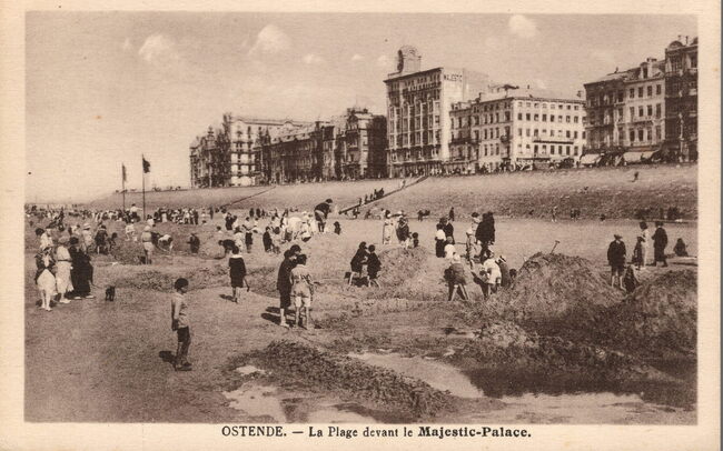 Le Bon. - Ostende - La Plage devant le Majestic-Palace. Majestic-Palace. Ouvert de Mars à Octobre. Eau courante. 80 Salles de Bains. De Zeedijk ten oosten van het kursaal richting de havengeul. In het midden het…