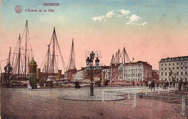 LUX. [M.B.C.P. = Maison Belge de la Carte Postale]. - Ostende - L'Entrée de la Ville. - Gekleurde kaart. - In mei 1919 werd de Keizerskaai gewijzigd in Vindictivelaan. We zien, rechts, het Hotel de la Couronne op de…