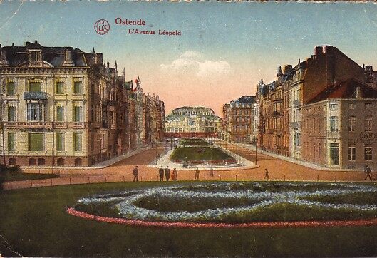 Lux. - Ostende - Place Léopold. - Gekleurde kaart. - Rechtdoor, de Rogierlaan met op het einde de Sint-Jozefskerk. Rechts, de Torhoutsesteenweg. Inventaris 2020/1117 fotoarchief D2 album 2 herkomst Simoens