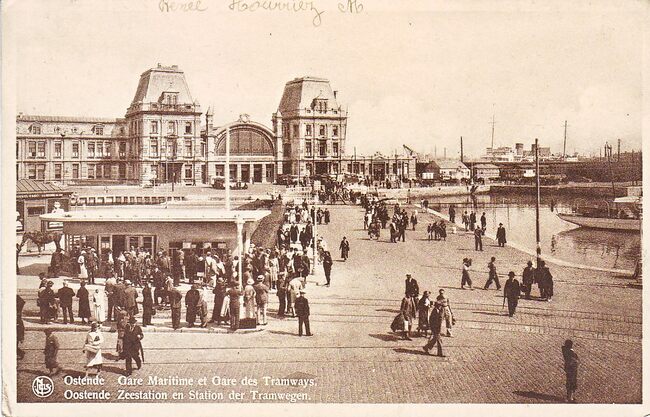 Nels, serie 13, nr 62. - Ostende - Gare Maritime et Gare des Tramways. - Oostende - Zeestation en Station der Tramwegen. - Vooraan, het tramwachthuisje "Oostende Kaai" voor de stadstram. Afgebroken in de april-…