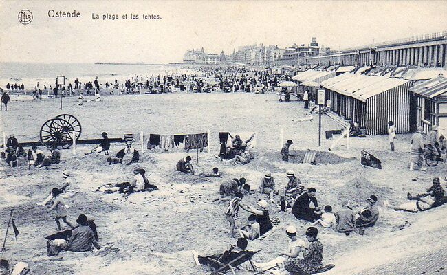 Nels. - Ostende - La plage et les tentes. - Strandrecreatie op het Groot Strand, gezien naar de Kursaal. Rechts, de Koninklijke Gaanderijen langs de Zeedijk. Waar de tenten in zeildoek staan was een stuk privé strand…
