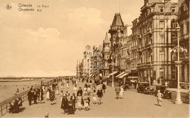 Nels Ostende, 28. - Ostende - Digue est. De Zeedijk gezien vanaf de Kursaal-Oosthelling richting havengeul. Rechts op de hoek het Hotel Royal Belge en ernaast het Hotel de Belle Vue. Let op de stijlvolle…