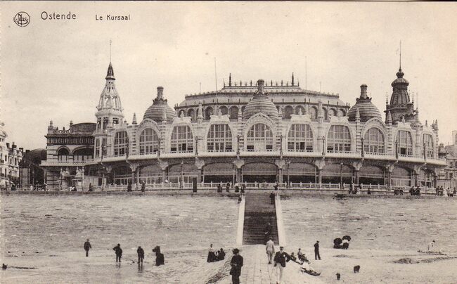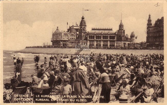 Nels, phototon, N° 2. - Ostende - Le Kursaal et la plage à marée haute. Oostende - Kursaal en strand bij vloed. - Strandrecreatie op het Groot Strand nabij de westelijke gevel van het derde Kursaal langs de Albert I-…