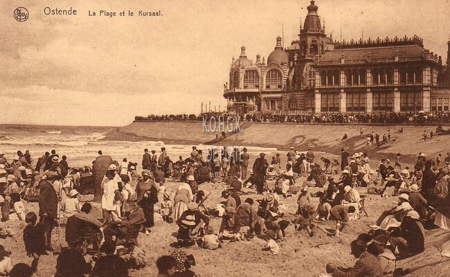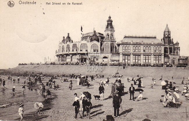 Nels, Série 13, N° 25. - Ostende - La Plage et le Kursaal. - Strandrecreatie op het Groot Strand nabij de westelijke gevel van het derde Kursaal langs de Zeedijk