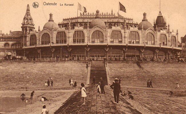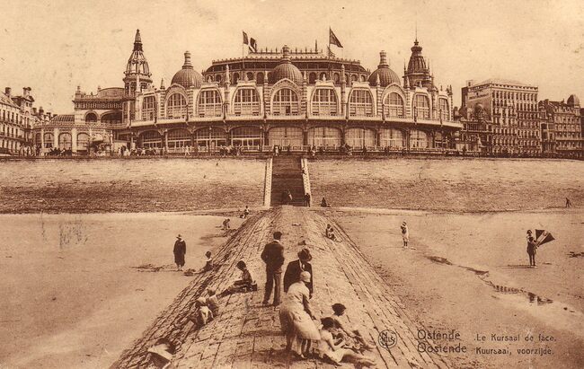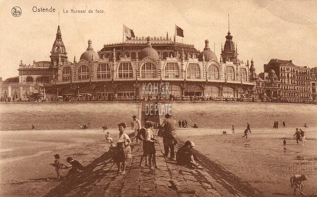 Nels. [Ern. Thill, Bruxelles, série 13, no.77]. Ostende - Le Kursaal de face. Oostende - Kursaal, voorzijde. De noordgevel. Het "groot strand" en golfbreker. Rechts spelen twee kinderen met een vlieger.