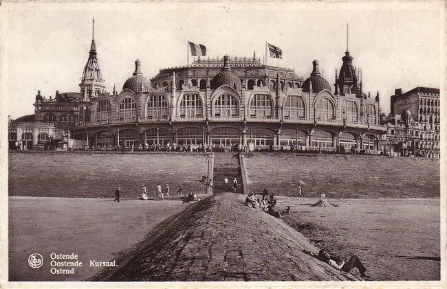 Nels, Série Ostende, N° 91. - Ostende - Le kursaal. - De noordgevel van het derde Kursaal langs de Zeedijk. Vooraan, het Groot Strand en golfbreker.