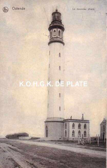 Nels. - Oostende - Sur l'Estacade. - We zien vanaf het einde van het Weststaketsel richting de oosteroever, de noodvuurtoren in functie na het vernielen van de tweede vuurtoren tijdens de Eerste Wereldoorlog, en de…