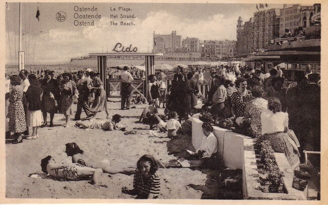 Nels. - Strandrecreatie op het Groot Strand. Rechts, de Koninklijke Gaanderijen en wat verder, de Nieuwe Gaanderijen en de Koninklijke Villa. Op het einde, de westgevel van het vierde Kursaal langs de Albert I-promenade…