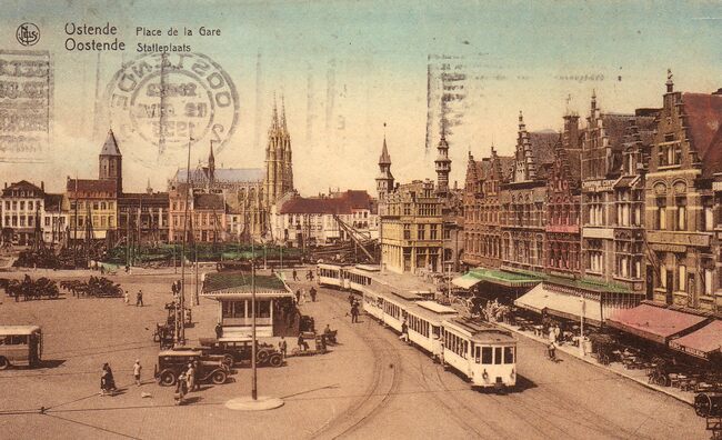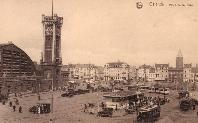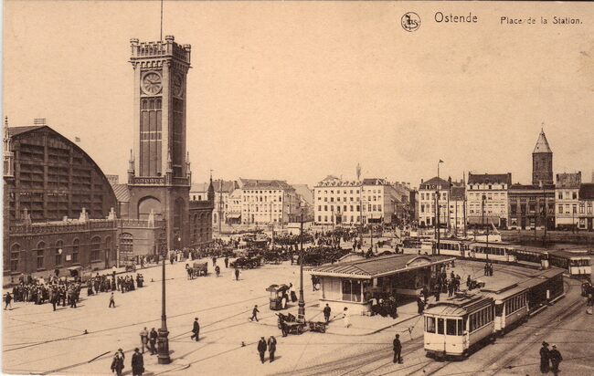 Nels. - Ostende - Place de la gare. De wijk Hazegras. Links, het tweede spoorwegstation van Oostende (Oostende-Stad), gelegen langs de Vandersweepplaats. Rechts, het tramwachthuisje voor de kust- en stadstram. Dit werd…