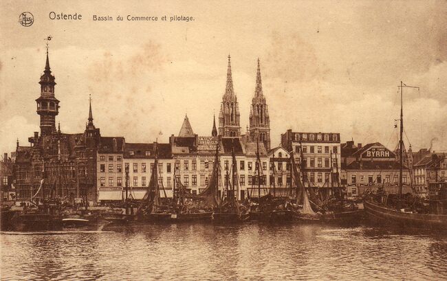 Nels. - Ostende - Bassin du Commerce et pilotage . - Vissersvaartuigen gemeerd in het eerste handelsdok langs de Vindictivelaan. Rechts, brasserie "Waterhuis". Links, het Zeevaartcommissariaat, ook "…