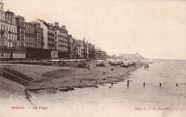Van Stalle/O.V.S. - Ostende - La Plage. De Zeedijk ten westen van het Kursaal, richting het Koninklijk Chalet, met op het einde het Royal Palace Hotel. Het Groot Strand en de traditionale badkarren. Het zomerseizoen…