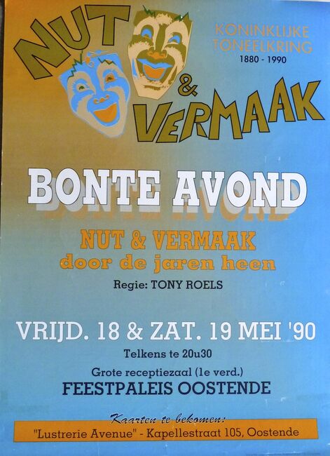 Affiche : Koninklijke toneelkring Nut en Vermaak. Bonte avond : Nut en Vermaak door de jaren heen. Feestpaleis Oostende. 18-19/05/1990