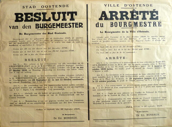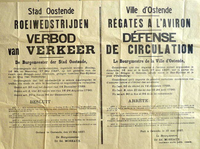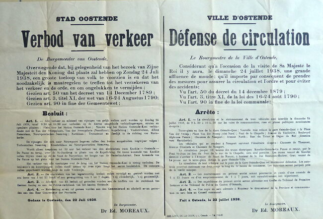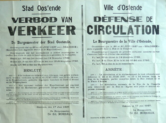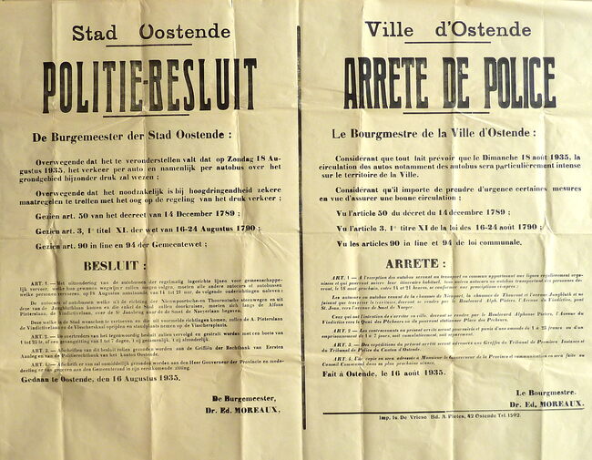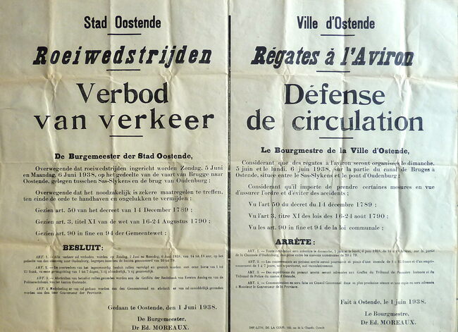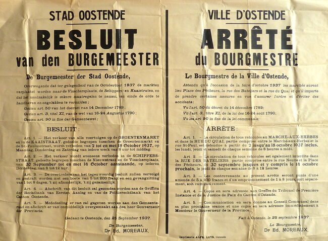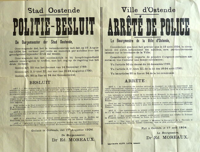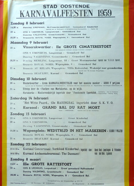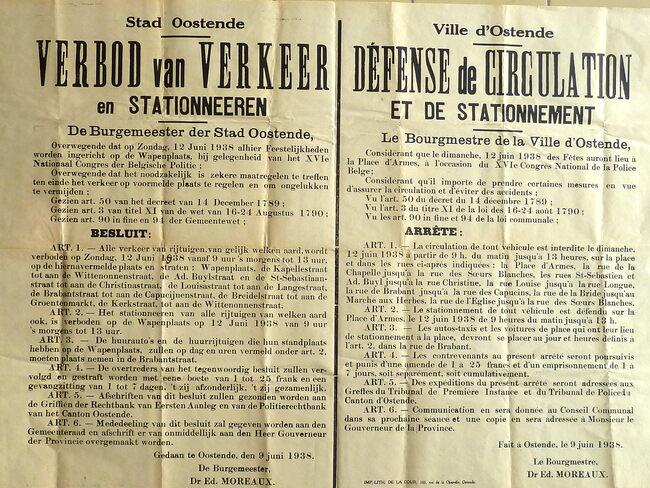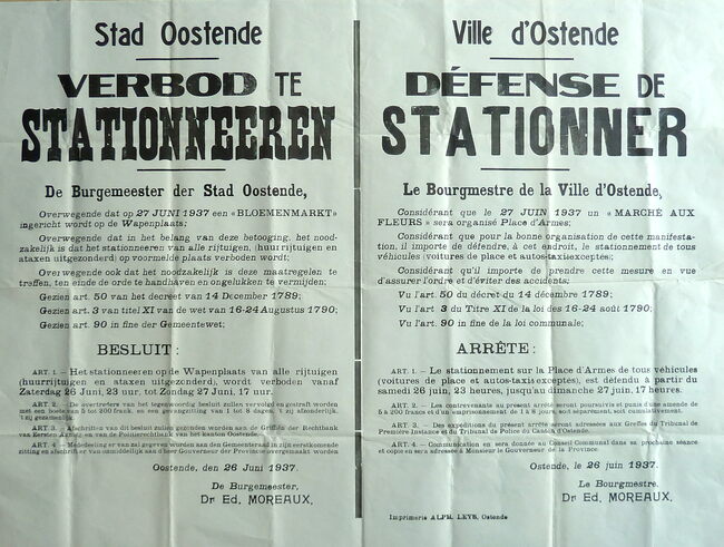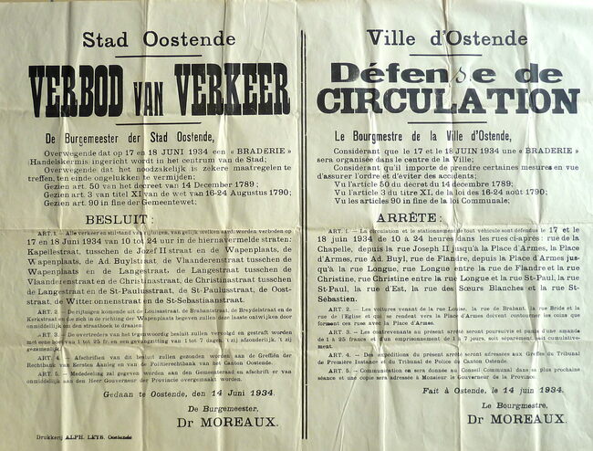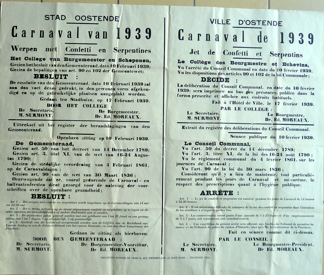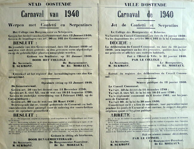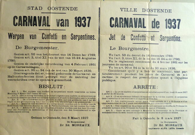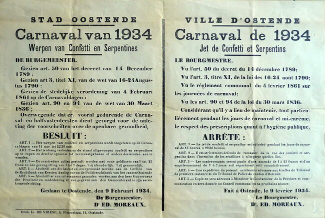 Formaat : 37 x 55 cm. - Tweetalig. - Ville d'Ostende. Carnaval de 1934. Jet de Confetti et Serpentins. Getekend : de burgemeester, Dr. Ed. Moreaux