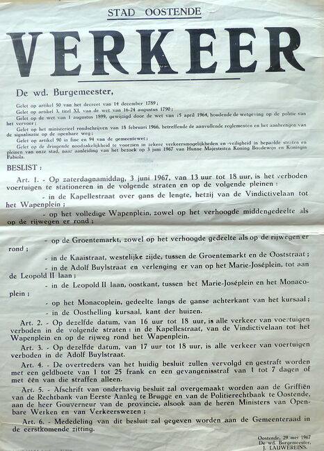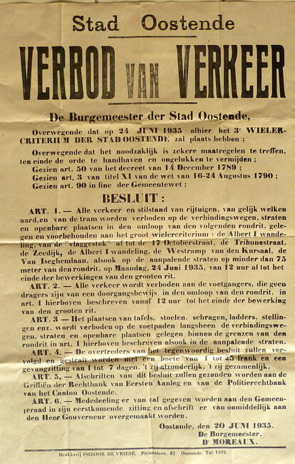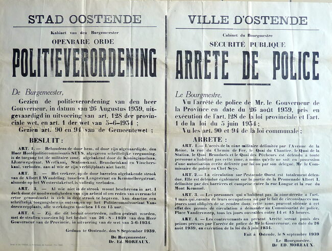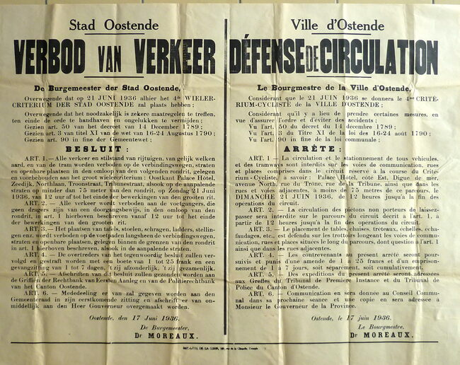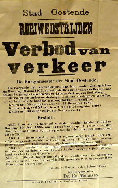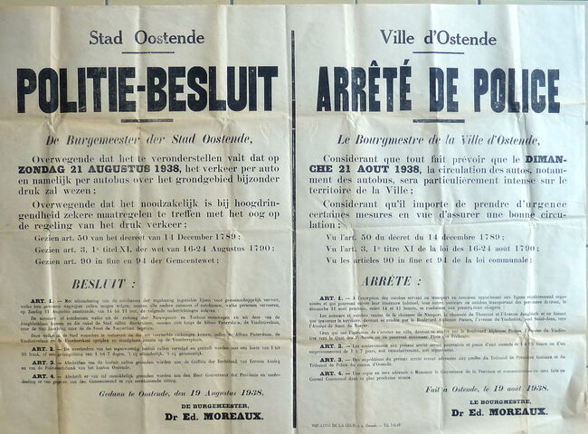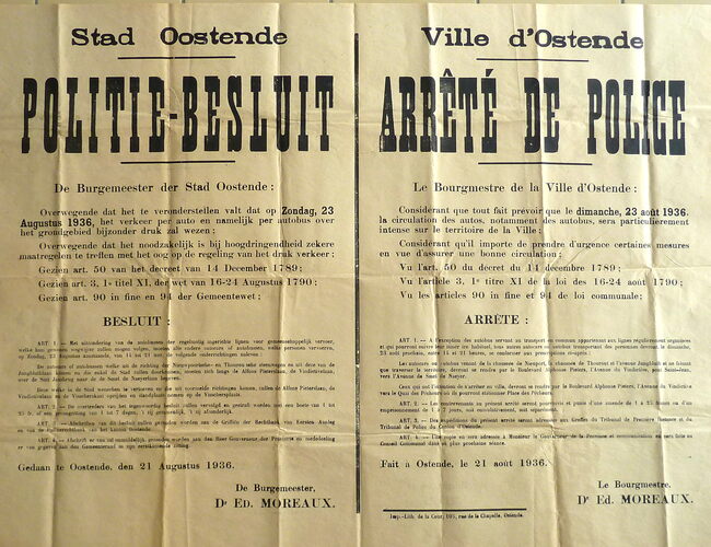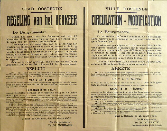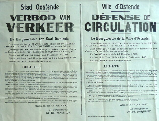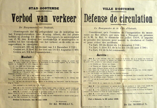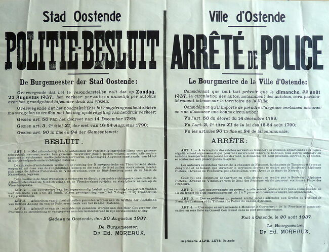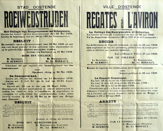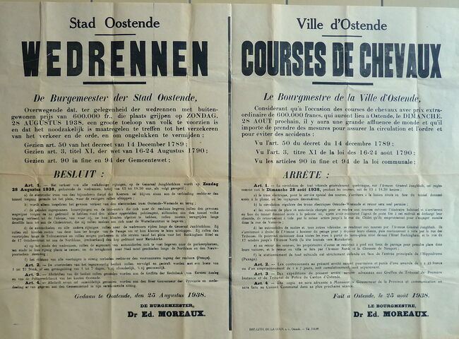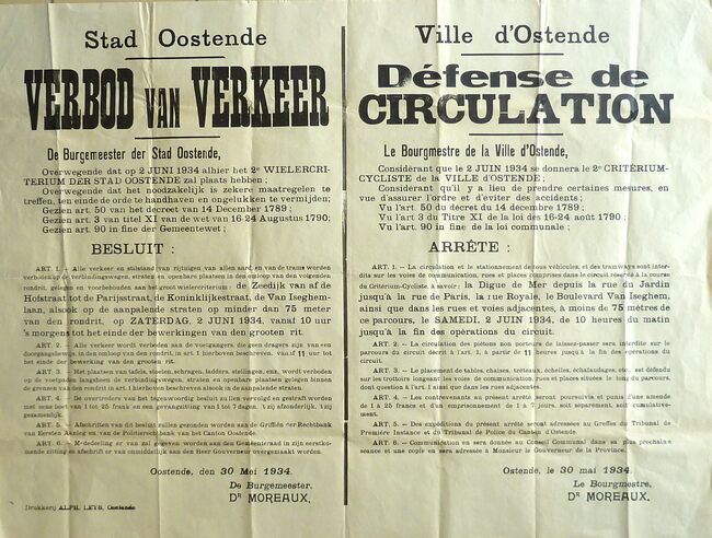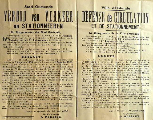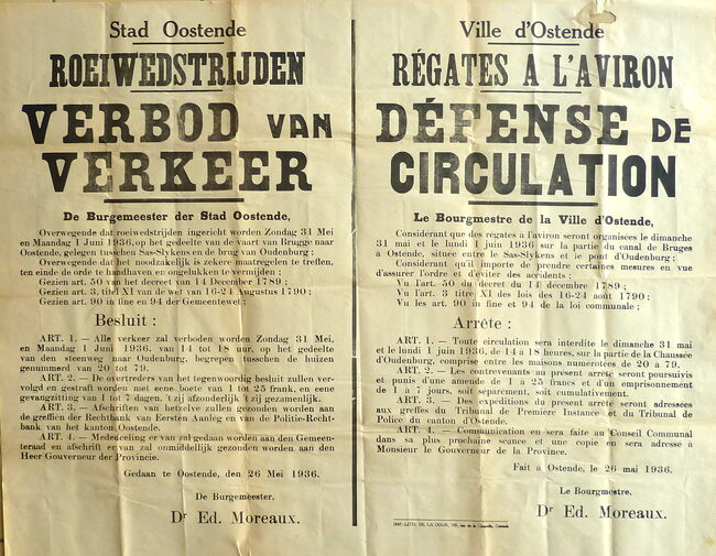 Formaat : 37 x 55 cm. - Tweetalig. - Ville d'Ostende. Carnaval de 1934. Jet de Confetti et Serpentins. Getekend : de burgemeester, Dr. Ed. Moreaux