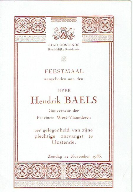 ter gelegenheid van zijne plechtige ontvangst te Oostende op zondag 12 november 1933