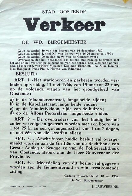 Formaat : 61 x 43 cm. - Verkeersregeling naar aanleiding van het bezoek van hare majesteit Koningin Elizabeth II en zijne koninklijke hoogheid Prins Philip, Hertog van Edinburg op vrijdag 13 mei 1966…
