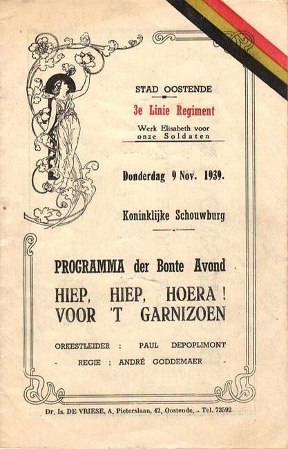 Programma der Bonte Avond op donderdag 9 november 1939 in de Koninklijke Schouwburg. 3e linie Regiment, Werk Elisabeth voor onze soldaten Orkestleider: Paul Depoplimont Regie: André Goddemaer…