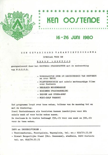 Een gevarieerd vakantieprogramma voor de derde leeftijd georganiseerd door het Oostends Stadsbestuur met de medewerking van F.O.G.O.D. (Federatie van de Oostendse verenigingen voor de derde leeftijd)