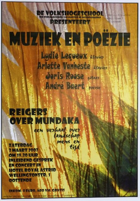 Formaat : 42 x 30 cm. Lydie Lequeux (klavier), Arlette Vanheste (klavier), Joris Roose (gitaar) en André Baert (poëzie). Reigers over Mundaka, een verhaal over landschap mens en tijd.