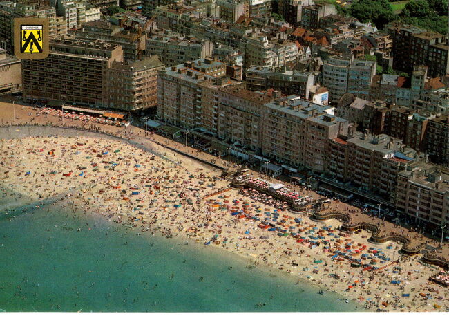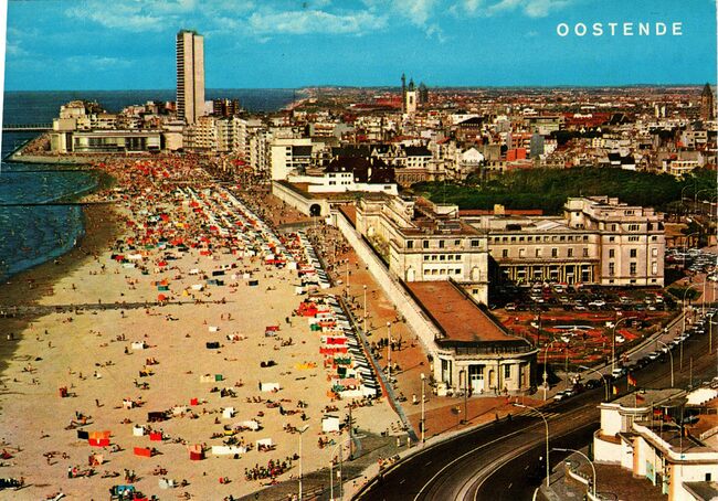 Van Mieghem A., N° 71. - Oostende - Panorama. - Vooraan, de ingang van de Wellingtonrenbaan langs de Koningin Astridlaan. Strandrecreatie op het Groot Strand. De Koninklijke Gaanderijen en het Thermae Hotel langs de…