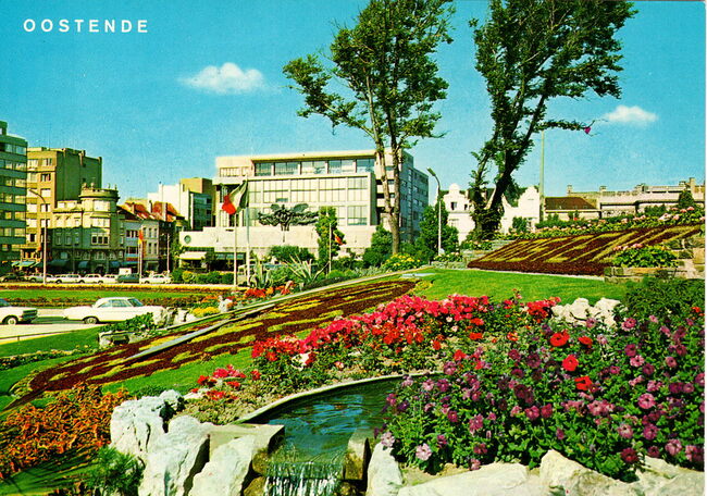 Van Mieghem A., N° 44. - Oostende - Bloemenuurwerk en Postgebouw. Horloge fleurie et Bureau des Postes. Flower-clock and Post-office. Blumenuhr und Postamt. - Het bloemenuurwerk in het Leopoldpark. Op de achtergrond, het…