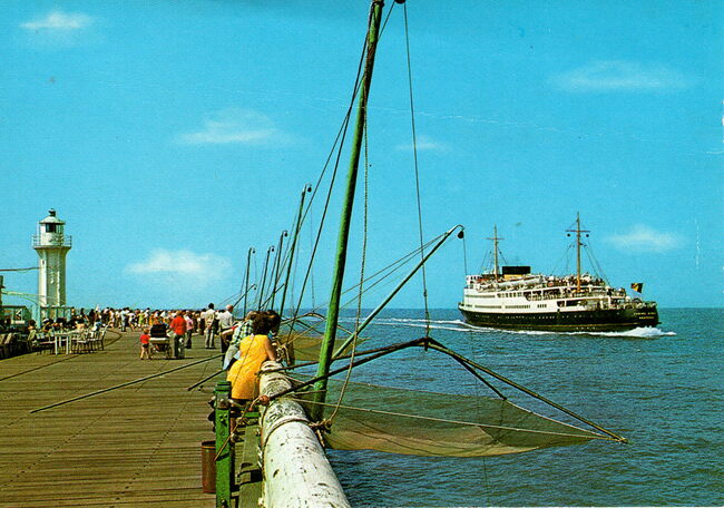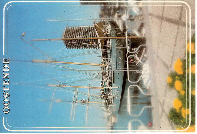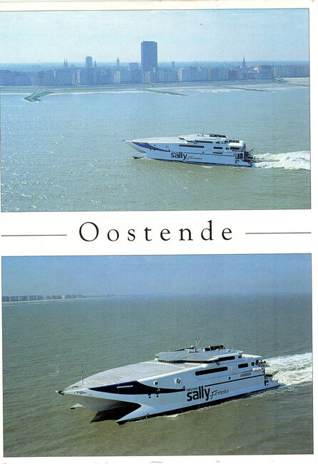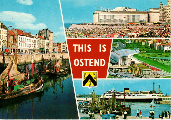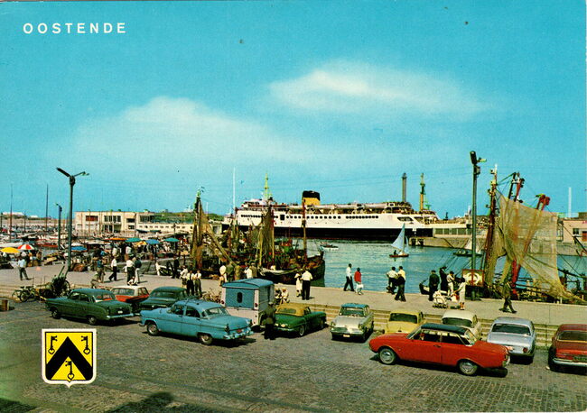 AVM, N° O/189. - Inzet : Een carferry van RMT-Sealink in de havengeul van Oostende. het beeldhouwwerk "De Zee" en het postgebouw. Verkoop van vis langs de Visserskaai. Het zeilschip "Mercator" als museum in de Mercator…