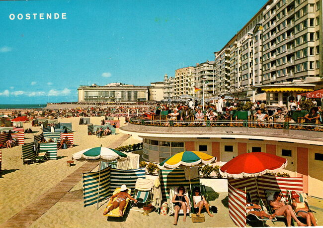 Van Mieghem A., N° 39. - Inzet : Vissersvaartuigen in het Montgomerydok langs de Visserskaai. Strandrecreatie op het Groot Strand met op de achtergrond de westgevel van de vierde kursaal langs de Albert I-promenade. De…