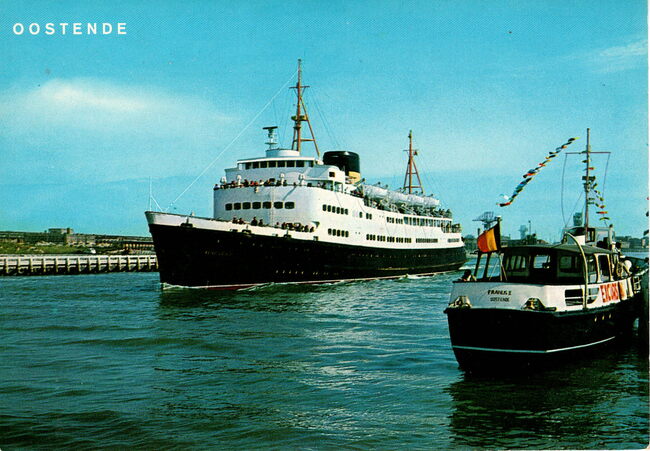 Van Mieghem A., N° 18. - Zeevaartlijn - Ligne Maritime Oostende-Dover. Pakketboot - Paquebot "Reine Astrid". - De pakketboot "Reine Astrid" van de Oostende Dover lijn in de havengeul van Oostende. Het excursieschip "…