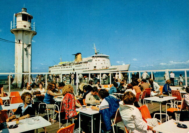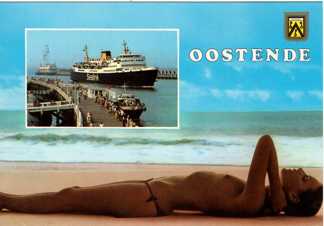 AVM, N° A 142. - Groeten uit. Un bonjour de. Greetings from. Grüsse aus Oostende. - Inzet : Een carferry van RMT-Sealink in de havengeul van Oostende. - Genieten in monokini van zon en zeelucht