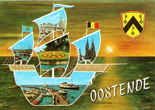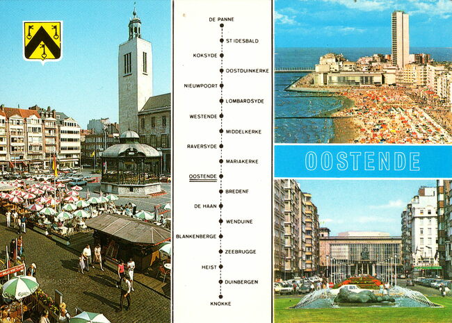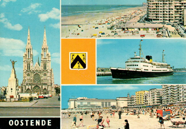 Links : afbeelding Sint-Petrus- en -Pauluskerk met op de voorgrond het oorlogsmonument ; Rechts boven : Groot Strand gezien vanaf Mariakerke ; Midden : een pakketboot ; onder :…
