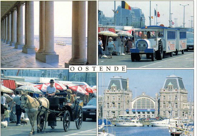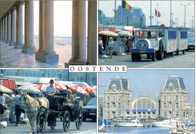 Koninklijke Gaanderijen (linksboven), Het treintje langs de Viserskaai (rechtsboven), paard en koets langs de Visserskaai (linksonder),…
