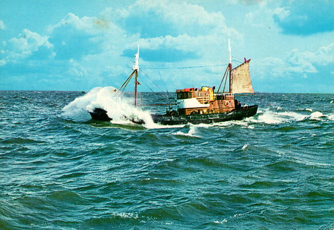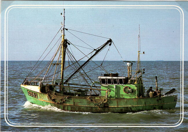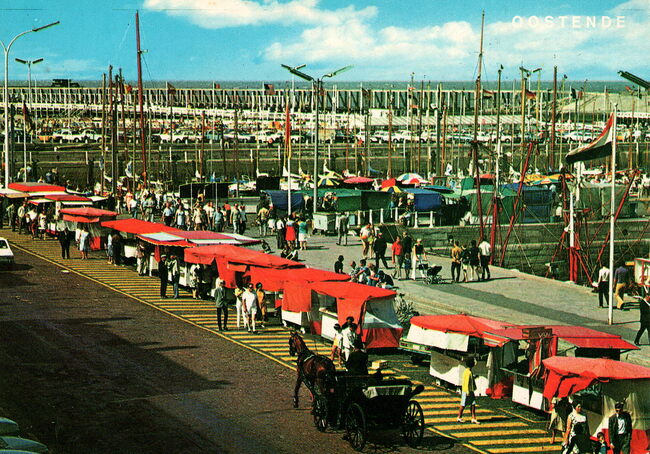 A. Van Mieghem, Oostende, N° A.278. - Met paard en koets op de Visserskaai langs de ambulante viskramen. De O.127 "Okeanos" in volle zee. Een carferry van de Oostende - Doverlijn.