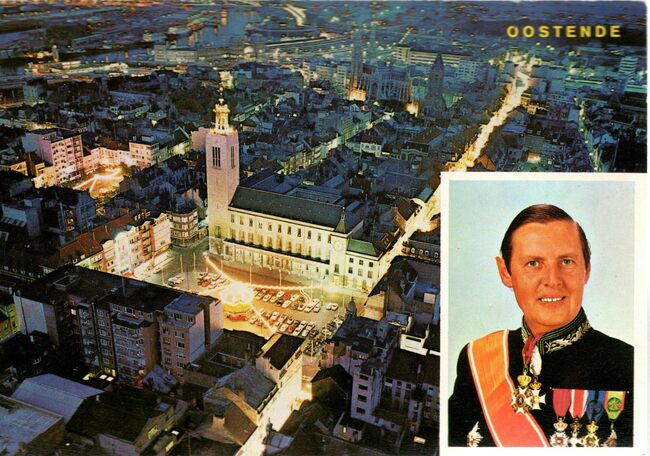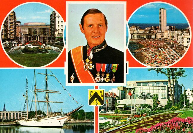 Multikaart. Inzet : Jan Piers ; Leopold II-laan ; Europacentrum ; "Mercator" (zeilschip museum) en het Postgebouw.