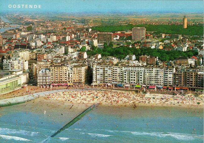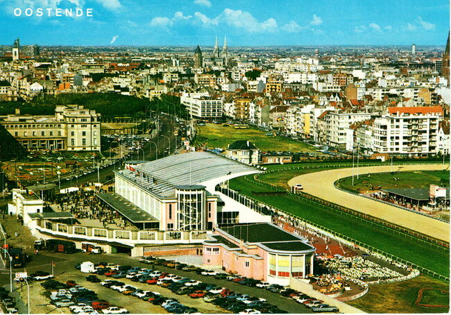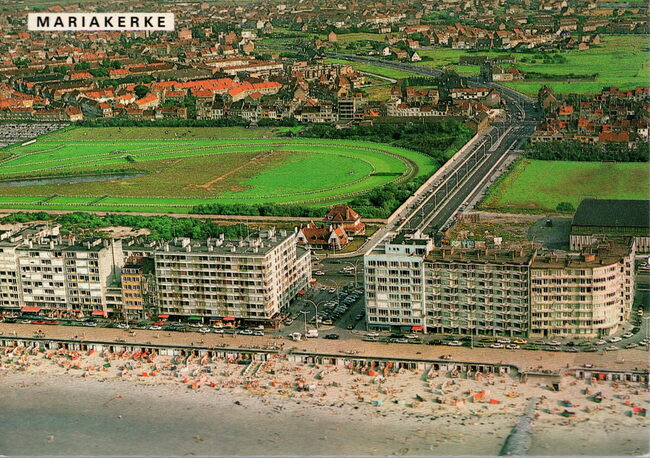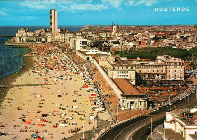 Van Mieghem/AVM. - We zien rechtsonder, detail van de ingang van de Wellingtonrenbaan gelegen langs de Koningin Astridlaan. Strandrecreatie op het groot strand. Het Thermae Palace en de Koninklijke gaanderijen langs de…