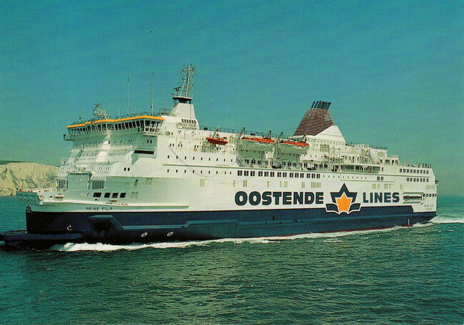 Van Mieghem A., N° 73. - Oostende - Staketsel en Maalboot. Estacade et La malle. Jetty and Mail-boat. Mole und Fährboot. - Het Weststaketsel. Een carferry van de Oostende Dover lijn verlaat de havengeul