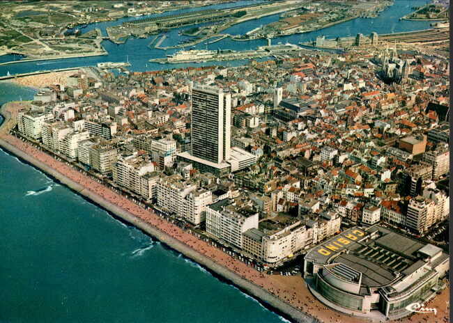 AVM, N° A.98. - Oostende - Luchtfoto - Panorama. - We zien het centrum van de stad met vooraan de Albert I-promenade en rechts, de Kursaal. De woontoren "Europacentrum" in de Van Iseghemlaan. Op de achtergrond, de…