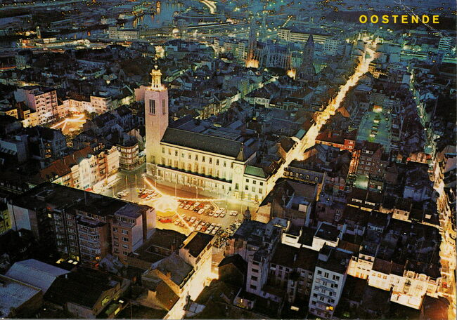 Van Mieghem 64. - Oostende - Panorama. Zicht op het verlichte Wapenplein met het Feest- en Cultuurpaleis. Rechts, de Christinastraat en dan de Kapellestraat. De straat vanaf de hoek van het Wapenplein…