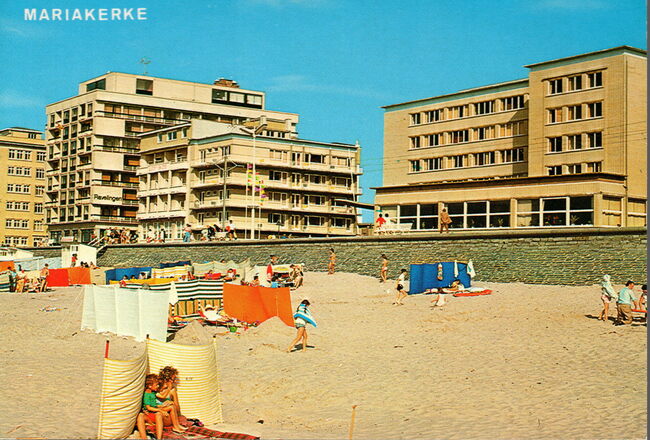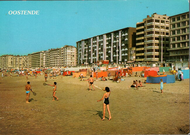 Van Mieghem/AVM 67. - Oostende - Strand en dijk - Plage et digue. Strandrecreatie en pootjebaden op het strand van Mariakerke. Links, de Residentie Royal Palace en op de hoek met de 17 Oktoberstraat, het gebouw…