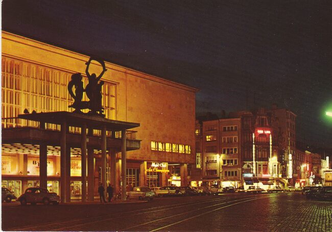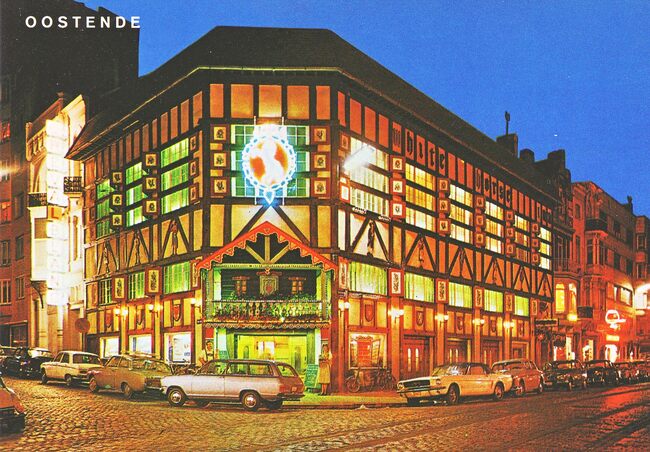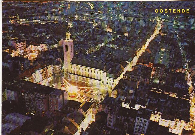 Postkaart AVM o126. - Nachtfoto van de zuidgevel van het vierde Kursaal gelegen langs de Van Iseghemlaan