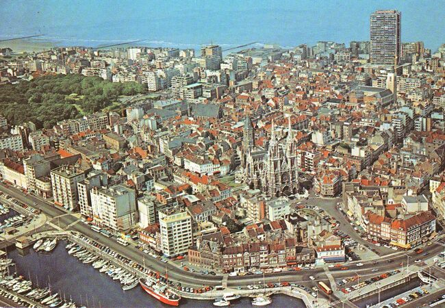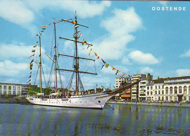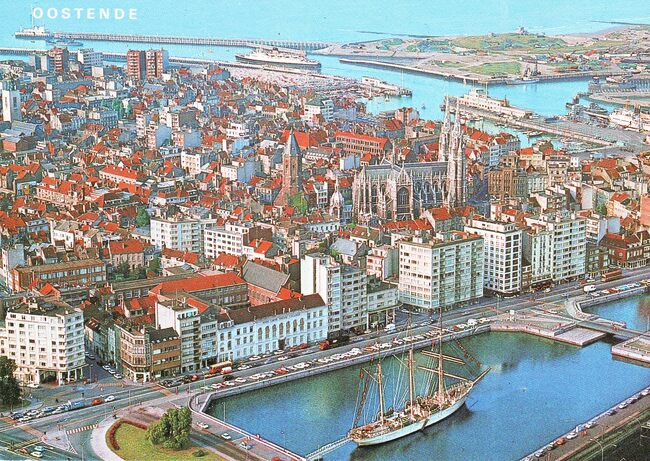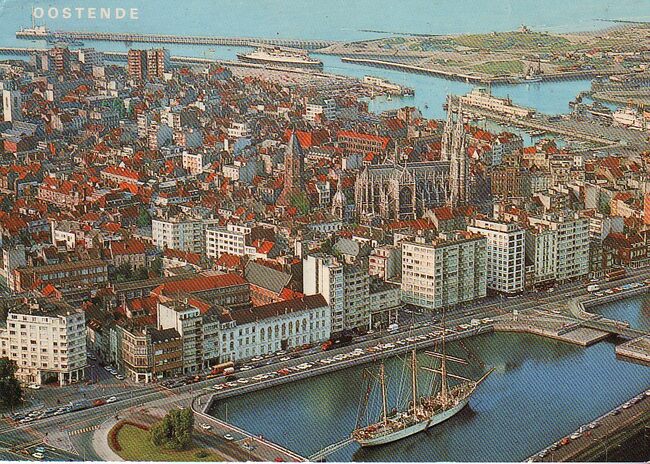 AVM, N° 20. - Het zeil- en schoolschip "Mercator" in het tweede handelsdok. Het Stadhuis langs de Leopold II-laan. Rechts, de Vindictivelaan met het OLV College