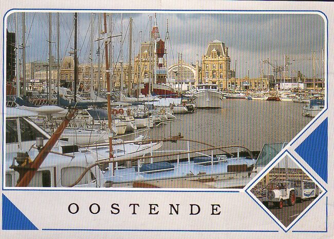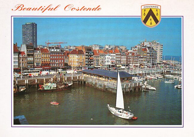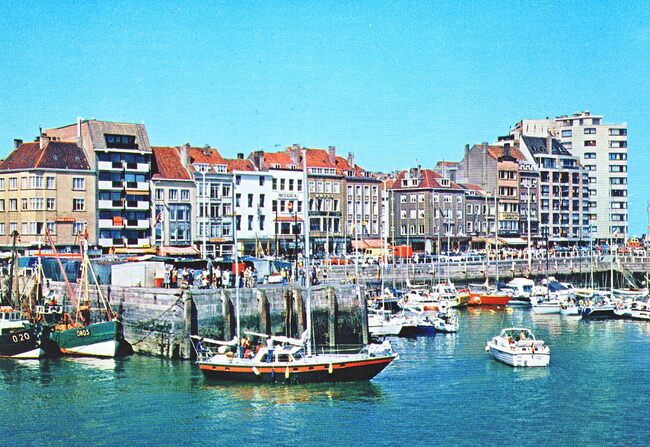 Postkaart AVM. - Plezier- en vissersvaartuigen gemeerd in het Montgomerydok nabij de Vistrap. Rechts, de O.718 "Yves-Patrick". Op de achtergrond, de Visserskaai, met de Nieuwstraat (links), de Cirkelstraat (…