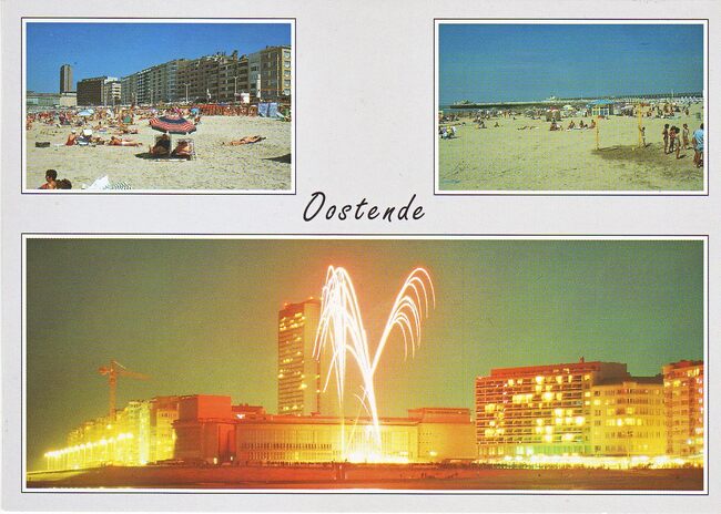 Postkaart AVM A.13. - De Albert I-promenade met het Groot Strand en de Lido. Vooraan links, de Nieuwe Gaanderijen met detail van de Koninklijke Villa en verder, het Thermae Palace Hotel met de Koninklijke Gaanderijen…