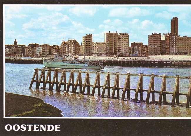 AVM, N° A.154. - De A.964 Heist vaart de haven van Oostende in. We zien het Weststaketsel en op de achtergrond, rechts, de appartementsgebouwen langs de Albert I-promenade. Links, de Visserskaai. - Ex M.929 Heist, in 1978…