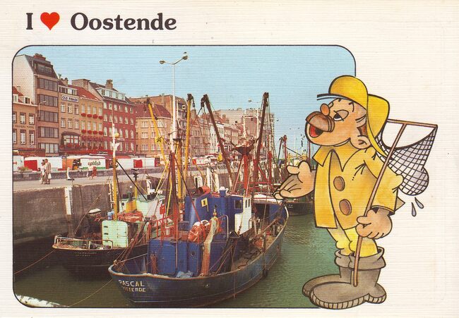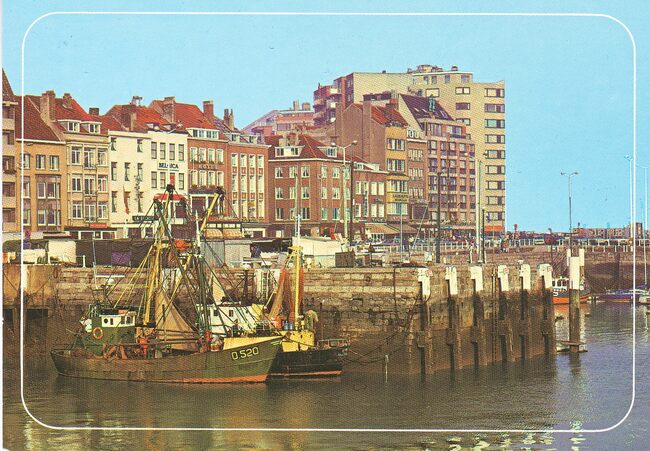 Postkaart AVM A.260. - Op de achtergrond, de Visserskaai. Twee vissersvaartuigen aangemeerd in het Montgomerydok nabij de Vistrap. O.a., de O.520 "Jill" aangekocht in 1978 door Rudy Babaix. In 1981 aangekocht…