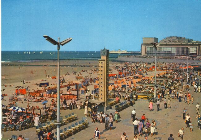 AVM o/197. - Het openbaar uurwerk van de badinstallaties onder de Albert I-promenade. Strandrecreatie op het Groot Strand en op de achtergrond, de westgevel van het vierde Kursaal