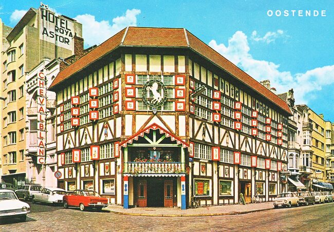 Van Mieghem A., N°11. - Het Sint Petrus en Paulusplein, met vooraan, het oorlogsmonument voor de gesneuvelde Oostendse burgers en militairen. Rechts, Hotel Maritime en hostellerie Old Shakespeare. Op de achtergrond, de…