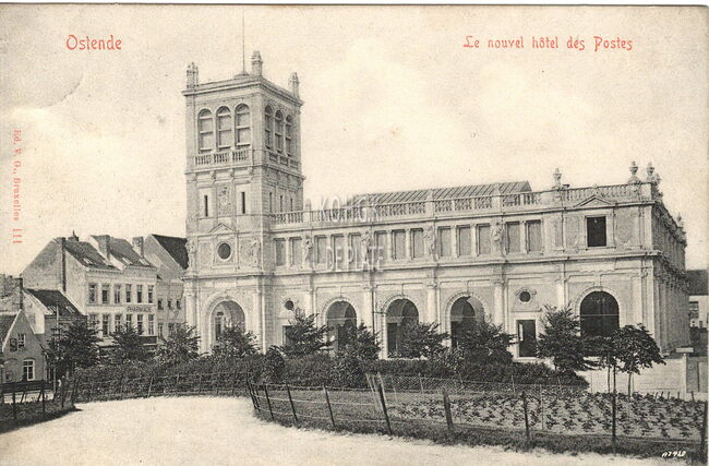 Ed. V.G., Bruxelles, N° 111. - Ostende - Le nouvel hôtel des Postes. - Het postgebouw langs de Hendrik Serruyslaan gezien vanuit het Leopoldpark. Links, de Wittenonnenstraat